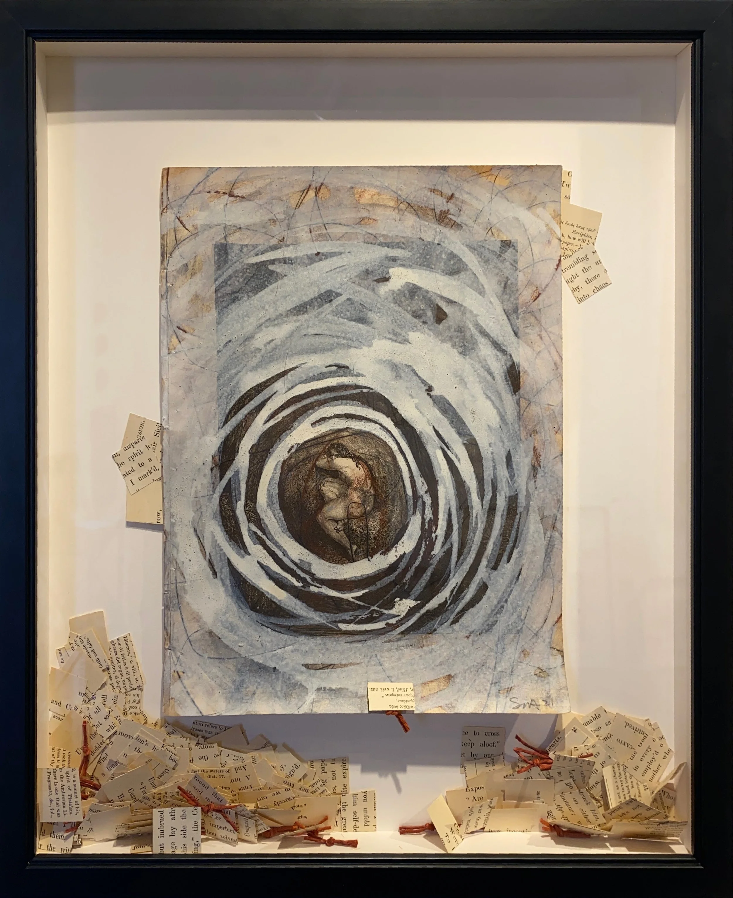 What begins as stream of consciousness content transitions into layers of ink, ash, dirt and acrylic washes that reveal human, plant, and shelter forms.